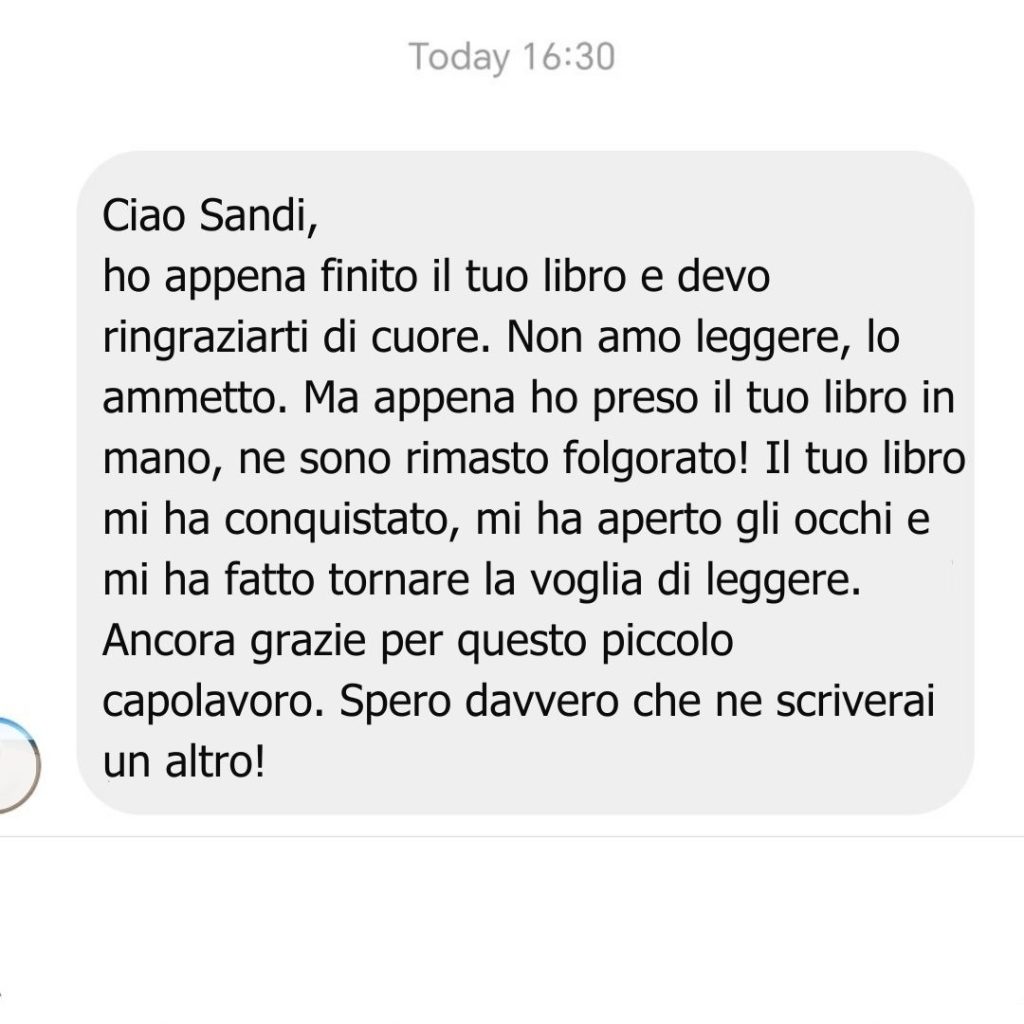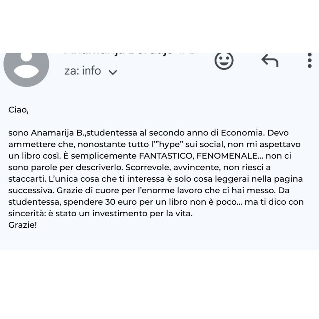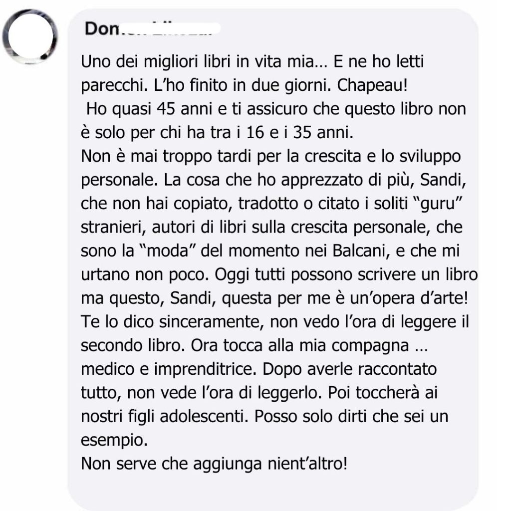 Che sia questo il libro che fa capire anche a chi “io non leggo”… che in realtà basta trovare il libro giusto. Un libro che può aprire un nuovo mondo: quello della crescita personale vera, di quella roba che nessuno ti insegna a scuola, ma che li potrà tornare utile nella vita reale di tutti i giorni. Un libro pieno di esperienza, consigli e lezioni di vita.