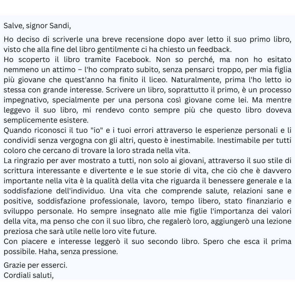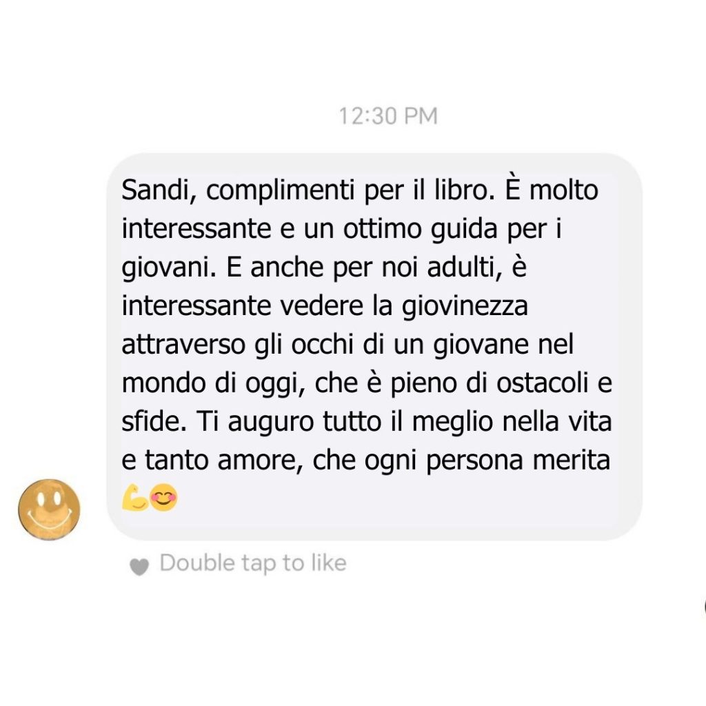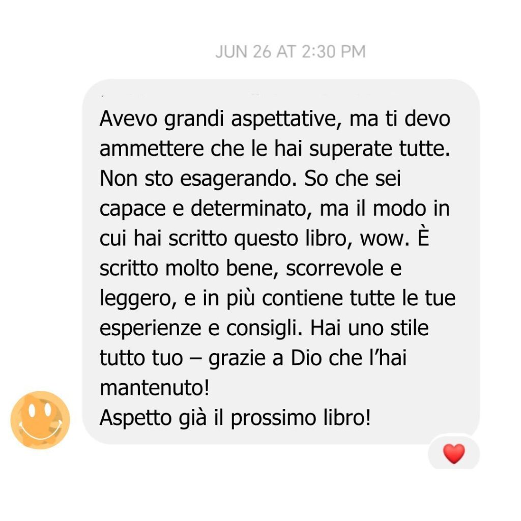 Che sia questo il libro che fa capire anche a chi “io non leggo”… che in realtà basta trovare il libro giusto. Un libro che può aprire un nuovo mondo: quello della crescita personale vera, di quella roba che nessuno ti insegna a scuola, ma che li potrà tornare utile nella vita reale di tutti i giorni. Un libro pieno di esperienza, consigli e lezioni di vita.